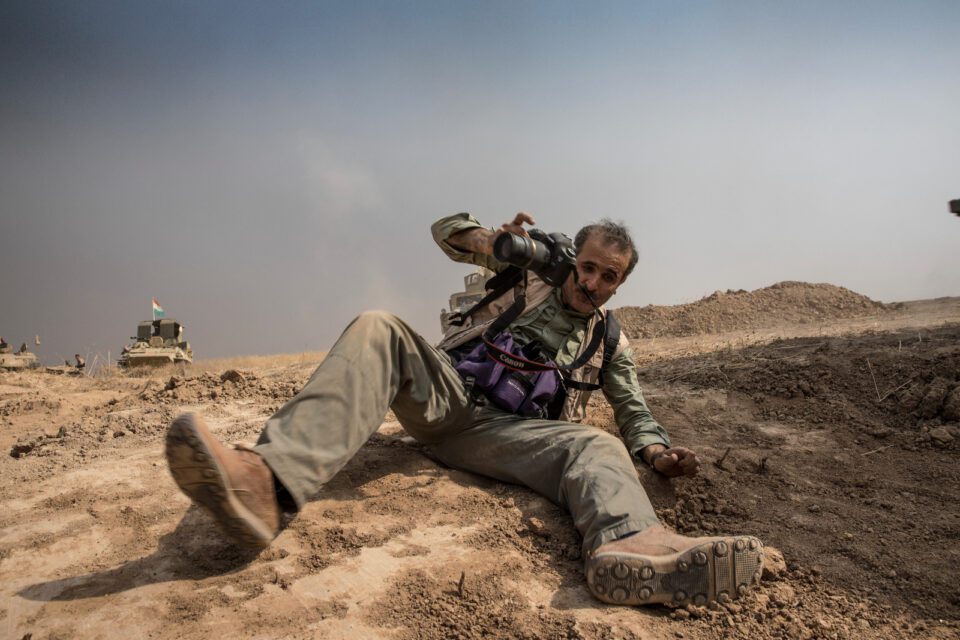 Through running and firing, we reached Bashiqa. Support forces were supposed to arrive. We waited behind the houses, but none came. A soldier beside me fell, struck by a sniper. Others gathered around him, struggling to stop the bleeding. I raised my camera. Seconds later, an explosion. The houses collapsed, the shelling surged. I shoved my camera between my legs, ducked my head. When I looked up, my camera was soaked in blood. Blood streamed from my forehead like a sudden storm.