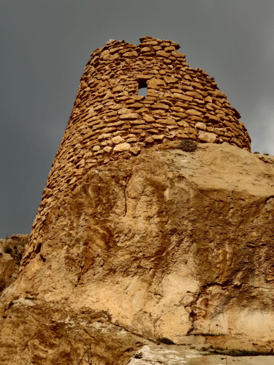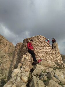 After more than an hour of climbing and passing several wells and ruins, we reach the top of the ridge where Khanzad Citadel stands at the highest point. The citadel is composed of two sections and two floors, appearing overall as a large military watchtower.