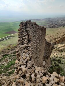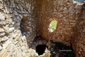 The first floor of the first section serves as an entrance; it is cylindrical in shape, though only three of its walls remain and the roof has collapsed. The rooms are small, roughly 3 by 3 meters. The second section is egg-shaped or domed, with its ceiling and roof still intact. The lower floor contains a room that appears to have been a prison. The roof of this room was constructed with stone, mortar, and gypsum. The walls feature several defensive embrasures (slits) that are wide on the inside and narrow on the outside. About 50 meters to the west, below these three rooms, stands another tower with 4-meter-high walls and several embrasures overlooking the Harir plain. Further down, the remains of the citadel’s enclosure wall stand at a height of 7 meters.