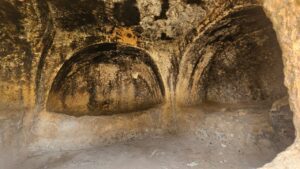 Various artificial caves, rooms, and small niches are carved into the mountain. These likely served as burial sites during the Zoroastrian era for high-ranking political or religious figures. They were also used as religious retreats (nawsk or nawus) during different eras, particularly the early Christian period, or as quarters for the project’s guards and workers.