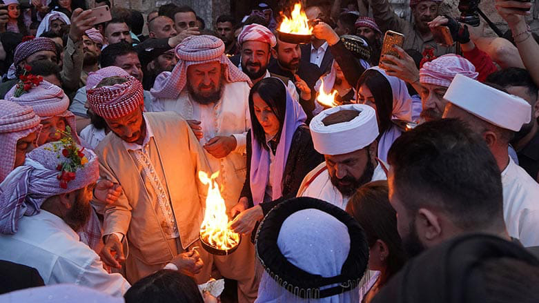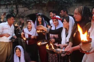 Each year, Yazidis from Kurdistan and abroad travel to the holy Lalish temple in Shekhan, where the central ceremonies are held in a peaceful and spiritual atmosphere. Youth gather flowers from the surrounding mountains, placing some at the temple’s small doorways and wearing others as ornaments.