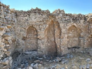 The eastern side of the castle is extremely rugged and features fewer man-made walls, as the natural terrain provided sufficient defense. However, the western side is flat, so significant attention was paid to the defensive walls there. In some sections, these walls remain standing at a height of nearly 10 meters with a thickness of about one meter. Several surveillance and defense points were built within it. The area of the castle is estimated to be one and a half dunams, containing a large courtyard and several rooms of different sizes. It also included a prison, a kitchen, bedrooms, halls, storehouses, and other chambers. The walls of some rooms remain at a height of 3 meters, while others have vanished. Due to neglect, most of the walls have collapsed.