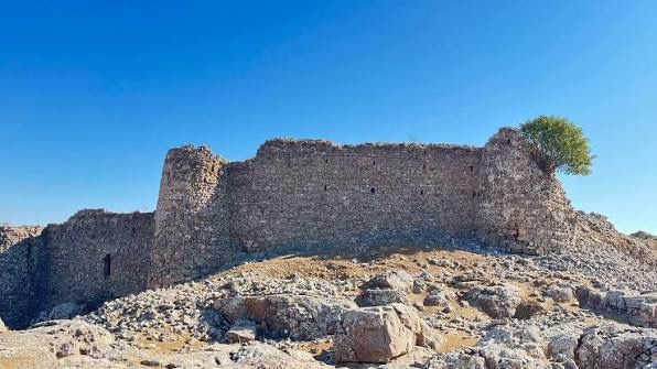 The eastern side of the castle is extremely rugged and features fewer man-made walls, as the natural terrain provided sufficient defense. However, the western side is flat, so significant attention was paid to the defensive walls there. In some sections, these walls remain standing at a height of nearly 10 meters with a thickness of about one meter. Several surveillance and defense points were built within it. The area of the castle is estimated to be one and a half dunams, containing a large courtyard and several rooms of different sizes. It also included a prison, a kitchen, bedrooms, halls, storehouses, and other chambers. The walls of some rooms remain at a height of 3 meters, while others have vanished. Due to neglect, most of the walls have collapsed.